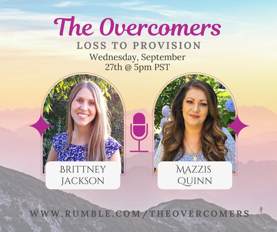 Fall is here (or spring depending on where you live)! I hope you’ve all had a wonderful summer. This episode is a little special because I interview my good friend Mazzis Quinn face-to-face! I welcome you to cozy up in your favorite spot with a warm blanket and a hot drink to hear her unique story. Have you ever hit a dead end and wondered which way to go? Mazzis found herself in this place and that’s where God met her. He has come through for her again and again. All of her needs were met, even if she had to wait until the last minute! Watch the episode here: https://rumble.com/v32egdq-episode-12-pain-to-purpose.html. Please like and subscribe to The Overcomers channel on Rumble so you don’t miss an episode. Jesus turned her loss into provision and he can do the same for you!