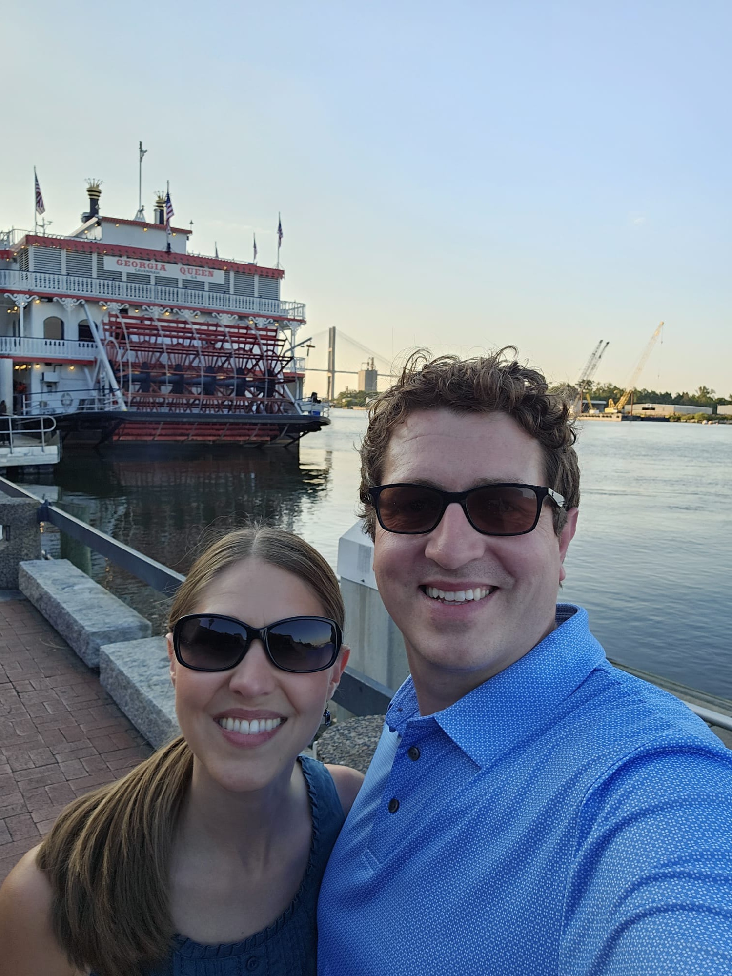 We enjoyed exploring this downtown district for the afternoon. Little square parks with trees and benches are located every few blocks, which are like small oases nestled in the middle of the vibrant city. We had a quick lunch at a Greek restaurant called Olympia Cafe, then we shopped around. There was a farmers market along the river selling all kinds of arts, crafts and products. We even saw river dolphins as we walked along the waterfront. However, the real gem that stood out is the glorious red and white, quadruple-decker riverboat called the Georgia Queen. We didn’t really plan anything specific for our visit to Savannah, but we thought we’d at least inquire about the times and prices of the boat rides. We were so excited to find out there were still tickets available for a dinner cruise that night for a reasonable price! We bought our tickets, went back to the van to change and then boarded the beautiful boat. The dinner was a multicourse buffet with shrimp and grits, chicken, fish, bread, salad and multiple sides. It was a feast! We even got peach cobbler for dessert… yum! The views of the river and the city from the riverboat are stunning at sunset. We watched a strip of red-orange light rest on the western horizon as the boat made its way down the river and back. There was lively entertainment on the boat as well. Musicians played on our deck as well as the top deck. Several people got out on the dance floor on our level, so of course I had to join them for the dance party! When the musician took a break, they played the Cha Cha Slide… one of my favorites! It was such a blast. Savannah was such a joy to experience. I look forward to hopefully visiting again in the future. After this wonderful day, we headed back to our KOA for the night. The next morning, we packed up and made our way south on I-95 to Florida.