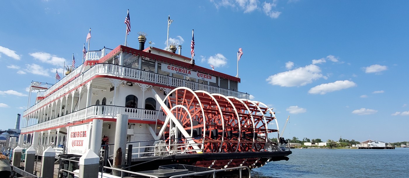 We enjoyed exploring this downtown district for the afternoon. Little square parks with trees and benches are located every few blocks, which are like small oases nestled in the middle of the vibrant city. We had a quick lunch at a Greek restaurant called Olympia Cafe, then we shopped around. There was a farmers market along the river selling all kinds of arts, crafts and products. We even saw river dolphins as we walked along the waterfront. However, the real gem that stood out is the glorious red and white, quadruple-decker riverboat called the Georgia Queen. We didn’t really plan anything specific for our visit to Savannah, but we thought we’d at least inquire about the times and prices of the boat rides. We were so excited to find out there were still tickets available for a dinner cruise that night for a reasonable price! We bought our tickets, went back to the van to change and then boarded the beautiful boat. The dinner was a multicourse buffet with shrimp and grits, chicken, fish, bread, salad and multiple sides. It was a feast! We even got peach cobbler for dessert… yum! The views of the river and the city from the riverboat are stunning at sunset. We watched a strip of red-orange light rest on the western horizon as the boat made its way down the river and back. There was lively entertainment on the boat as well. Musicians played on our deck as well as the top deck. Several people got out on the dance floor on our level, so of course I had to join them for the dance party! When the musician took a break, they played the Cha Cha Slide… one of my favorites! It was such a blast. Savannah was such a joy to experience. I look forward to hopefully visiting again in the future. After this wonderful day, we headed back to our KOA for the night. The next morning, we packed up and made our way south on I-95 to Florida.