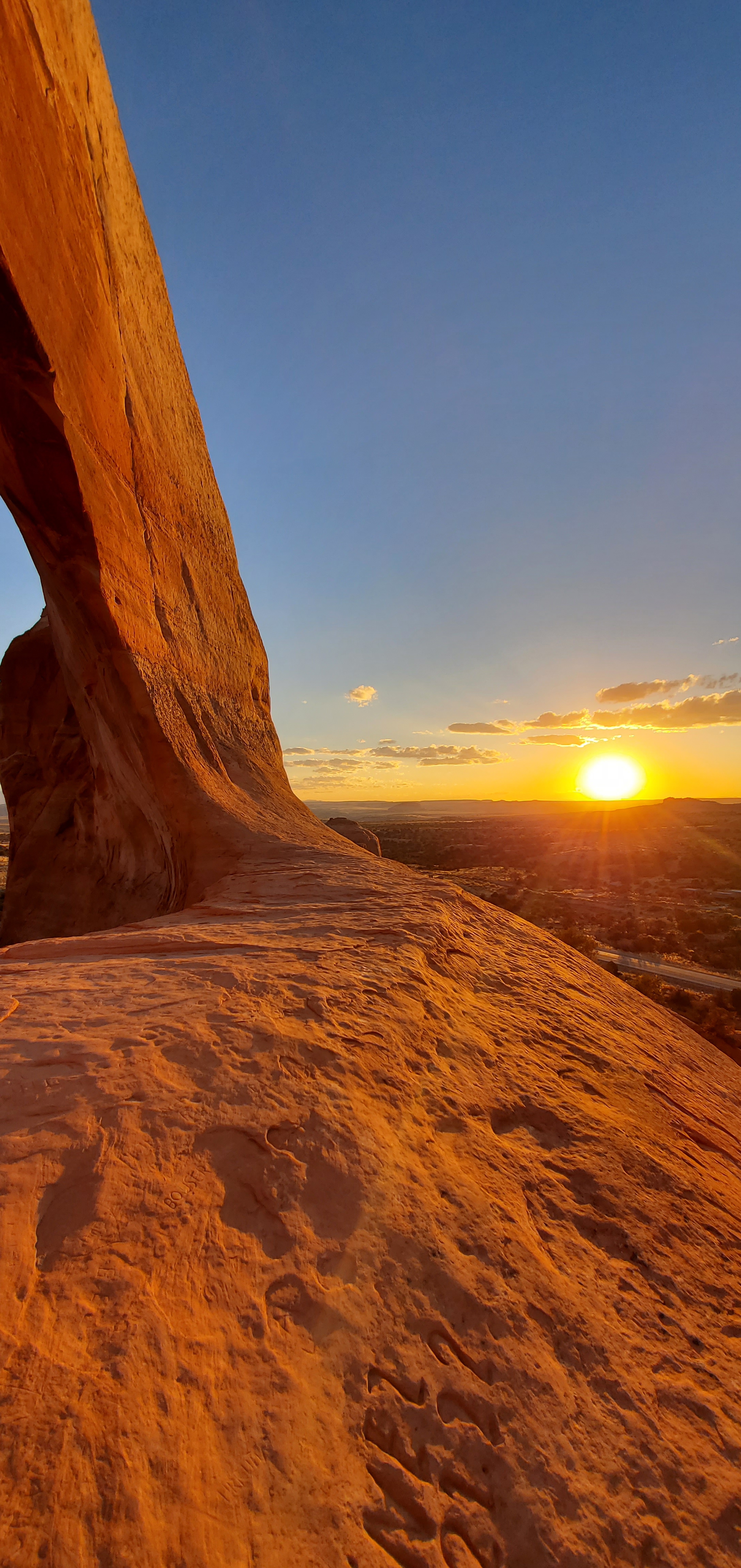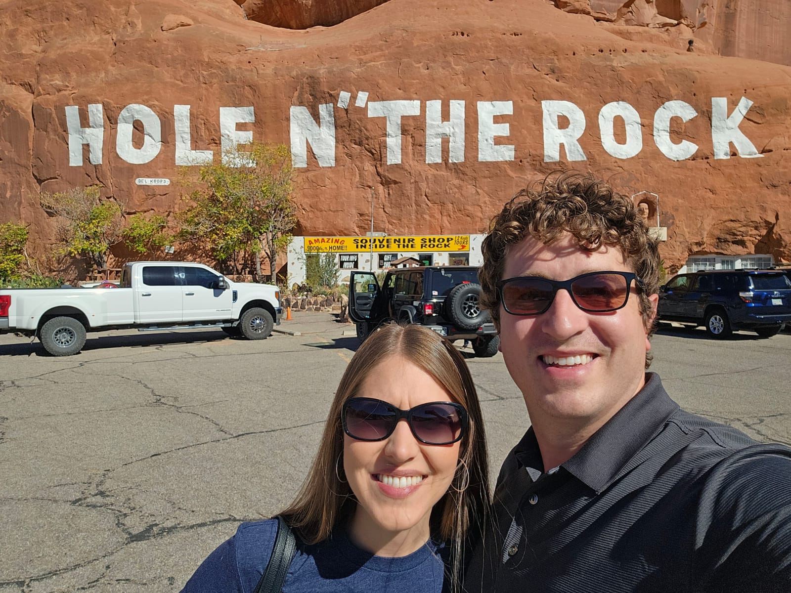 The sun was heading down for the day, which cast a beautiful golden light across the desert landscape and rugged rock formations. We stopped at Church Rock and then at Wilson Arch for some pictures. I visited Wilson Arch as a kid on the road trip with my grandparents, so I was eager to see it again as an adult. The whole arch was lit up bright orange because the sun was setting as we climbed up to the top. We got the most incredible pictures up there and we soaked in every last ray of the gorgeous sunset. We did not plan this day out to the minute, but God did. He had such sweet moments for us to discover, which is one of my favorite things about going on adventures with Jesus. After the sun had set, we climbed down and continued up to Moab. We passed by Hole N” The Rock (more on that in a minute) and finally made it to our KOA Holiday in Moab, which has to be one of the coolest KOA’s in all of America! It has a pool, multiple hot tubs and outdoor gas fire pits and a snack bar that’s open late. It was so nice to relax by a fire after multiple hours of driving. I highly recommend this updated and clean KOA if you want a glamping experience while visiting Moab.